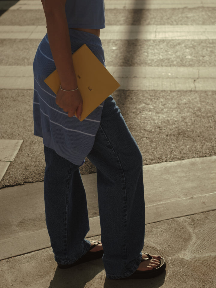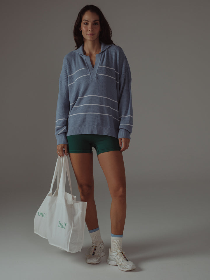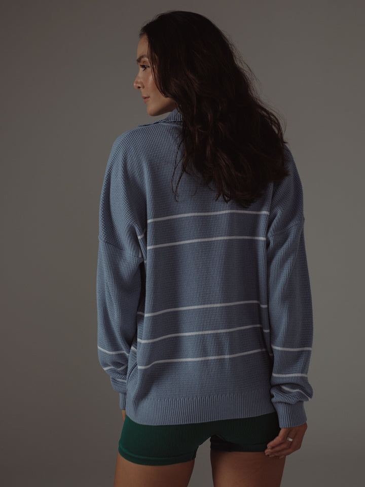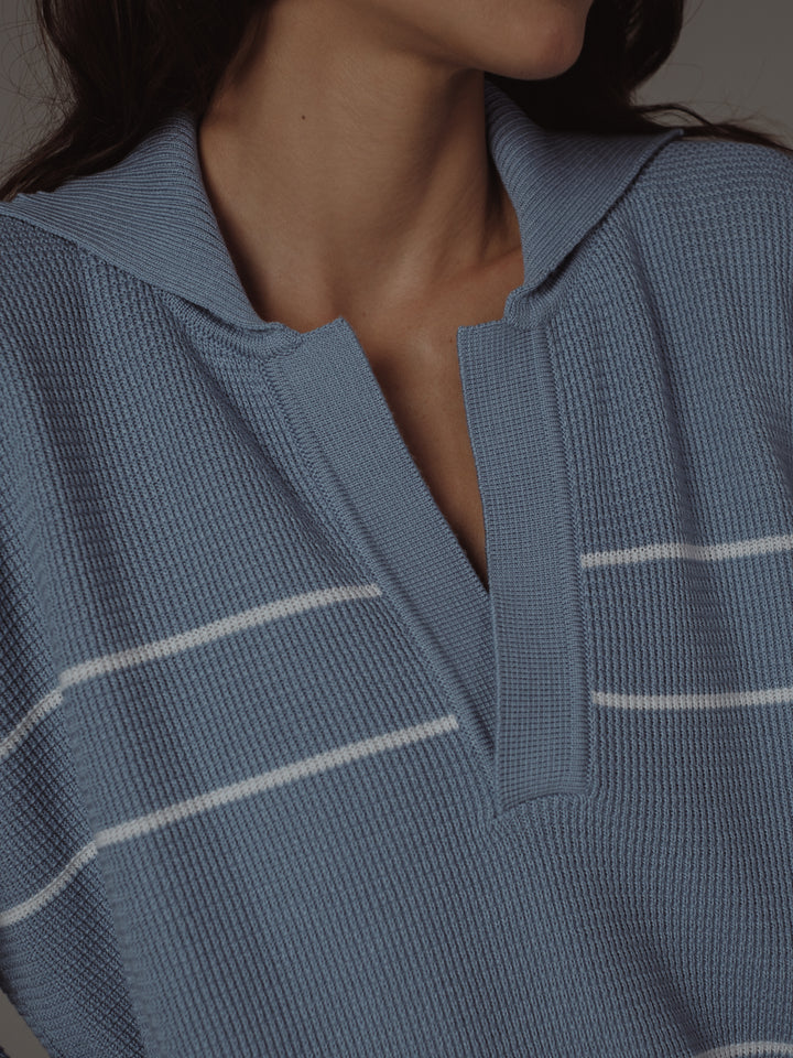 Comfort all day, every day con nuestro buzo tejido color azul claro, una pieza diseñada con cuello camisero y líneas en contraste color crema. This piece it's meant to be con nuestros jeans y pantalones para mujer.