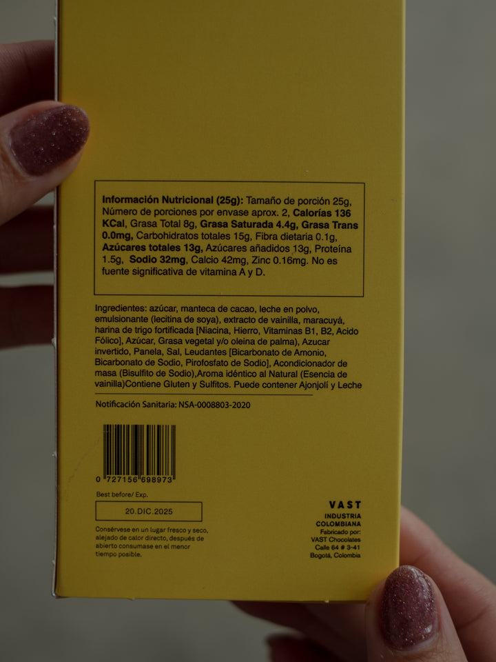 Azúcar, manteca de cacao, leche en polvo, emulsionante (lecitina de soya), extracto de vainilla, maracuyá, harina de trigo fortificada (Niacina, Hierro, Vitaminas B1, B2, Ácido Fólico), grasa vegetal y/o oleina de palma, azúcar invertido, panela, sal, leudantes (Bicarbonato de Amonio, Bicarbonato de sodio, pirofosfato de sodio), acondicionador de masa (Bisulfito de sofio), Aroma indéntico al natural (Esencia de vainilla). Contiene gluten y sulfitos. Puede contener ajonjolí y leche.