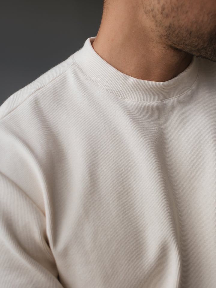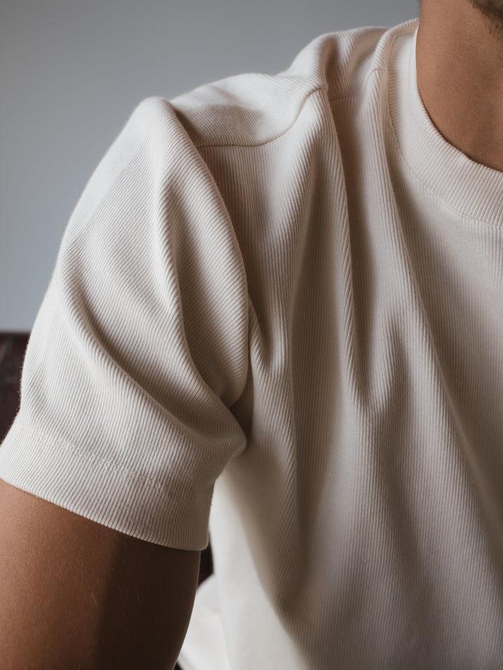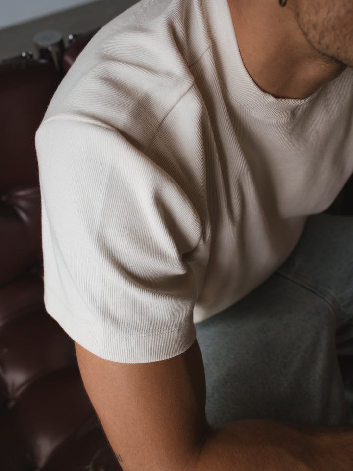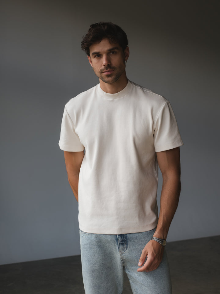 Cotton basics just got better. Nueva camiseta manga corta color crema diseñada en silueta ajustada y cuello redondo en rib. Match t-shirt up con nuestros jeans y pantalones.
