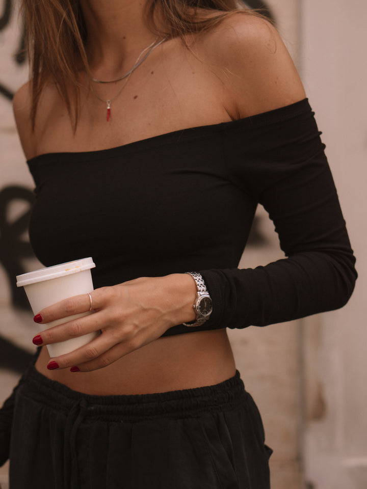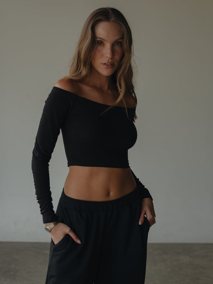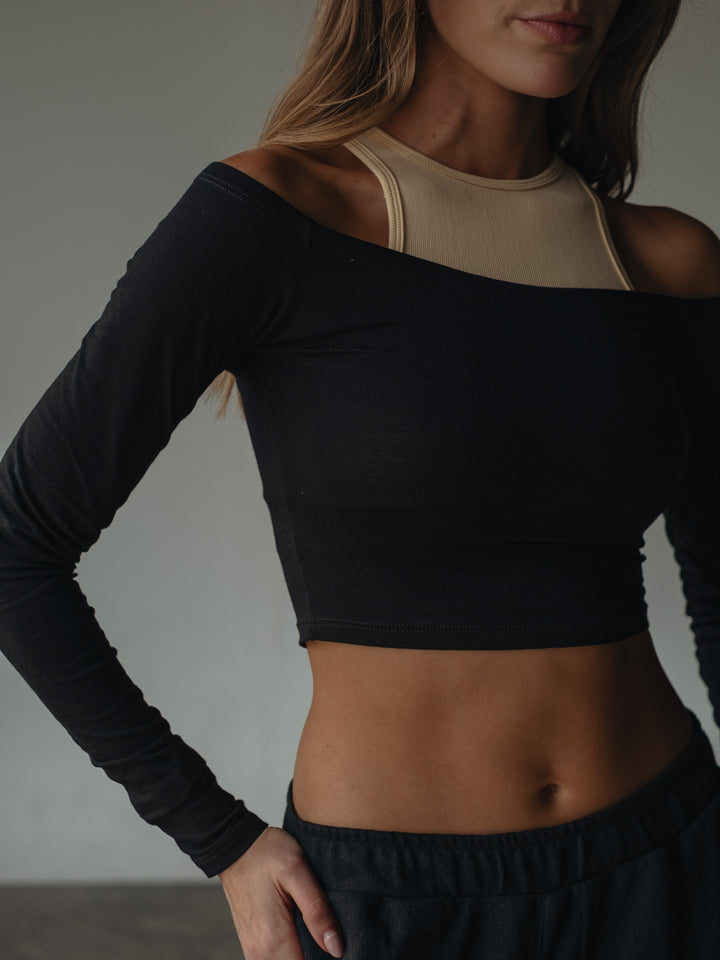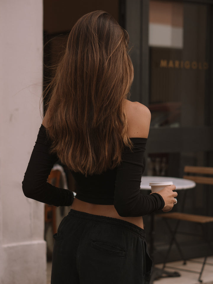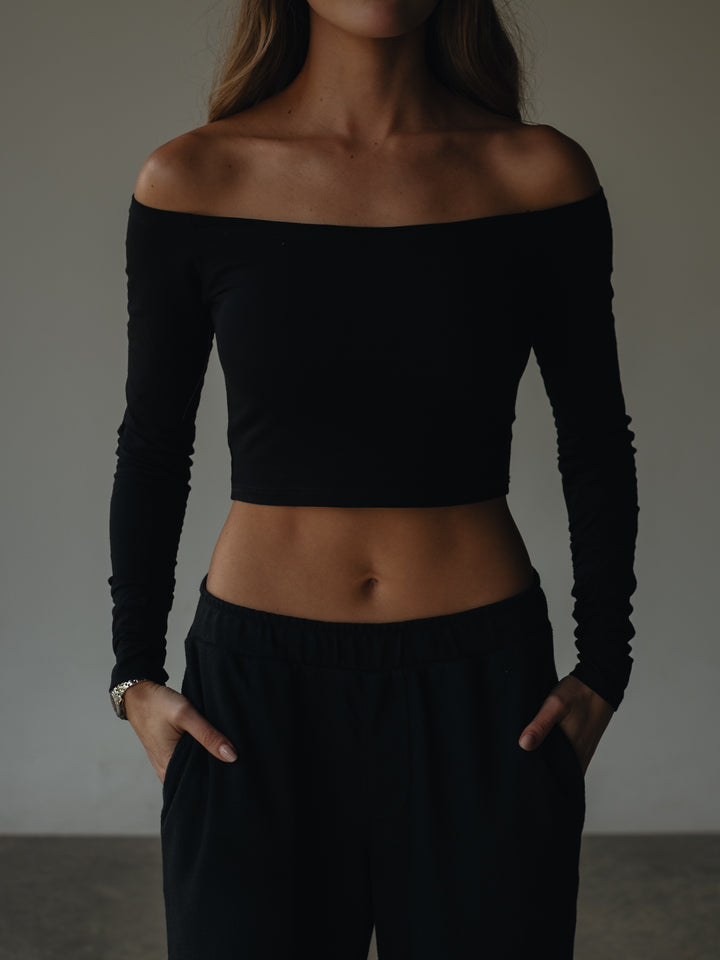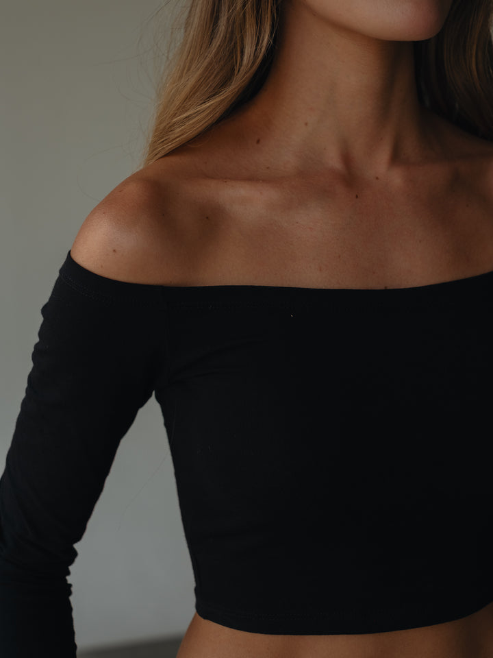 Take your shoulders out con nuestro nuevo crop top de apariencia lisa color negro, una pieza manga larga drapeada con un estilo de los 00's. Match this crop up con tus jeans y pantalones favoritos.