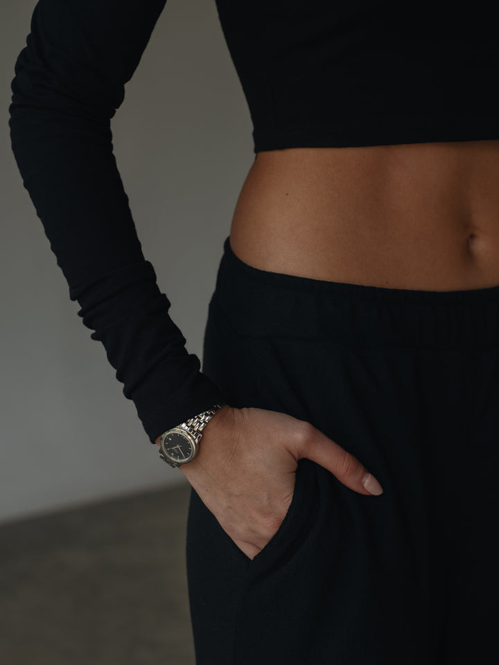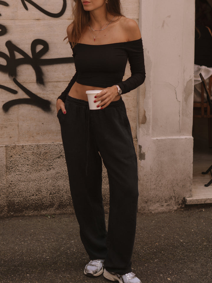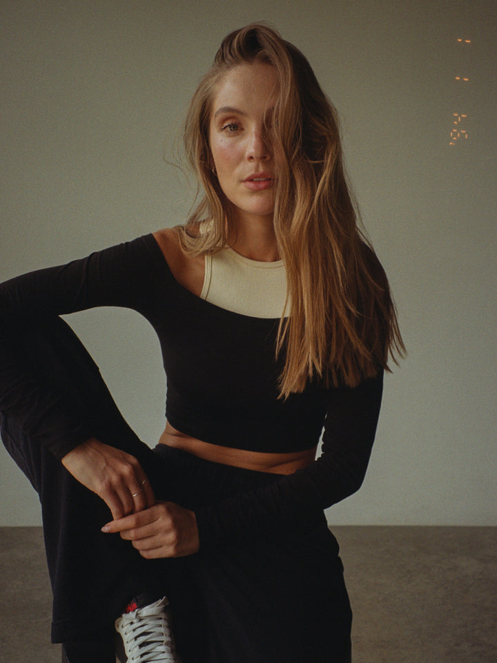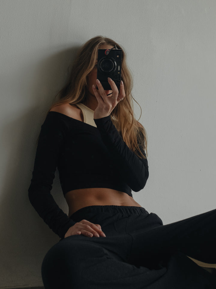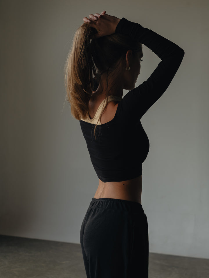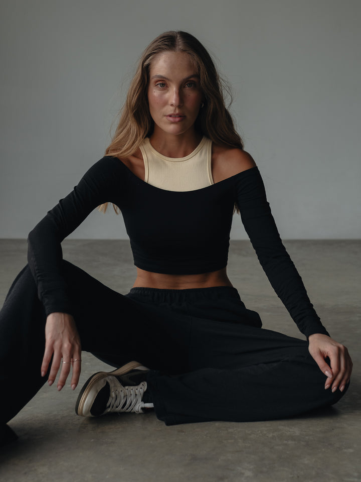 Take your shoulders out con nuestro nuevo crop top de apariencia lisa color negro, una pieza manga larga drapeada con un estilo de los 00's. Match this crop up con tus jeans y pantalones favoritos.