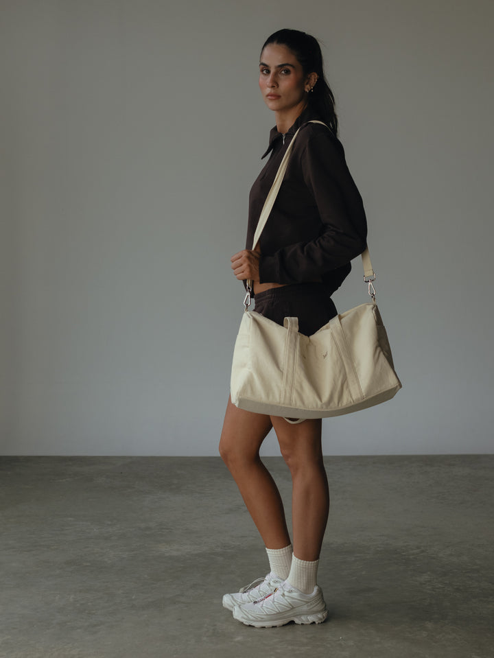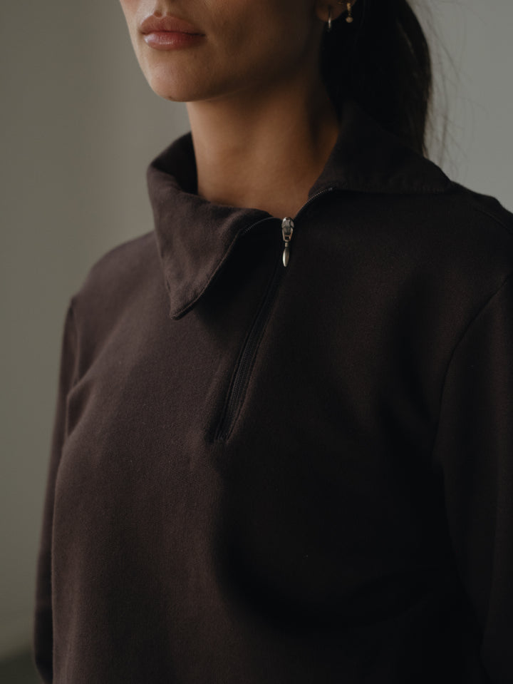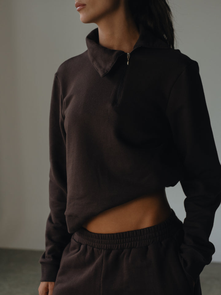 Comfort all day, every day con nuestro nuevo buzo color café, una pieza diseñada con cremallera frontal asimétrica y cuello camisero. This piece it's meant to be con nuestras piezas deportivas.