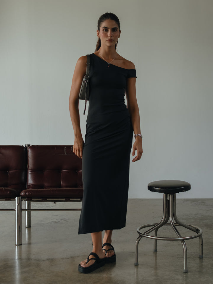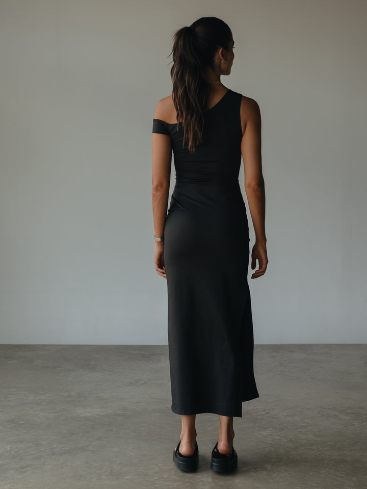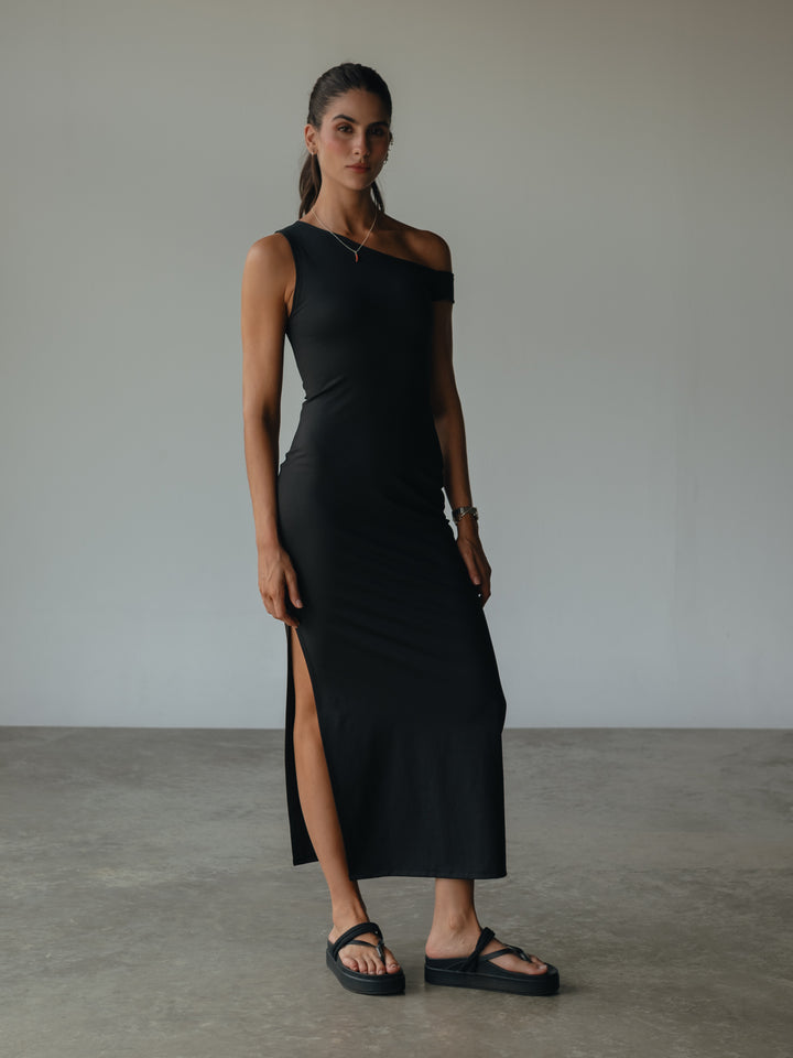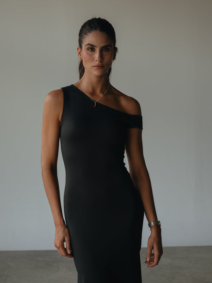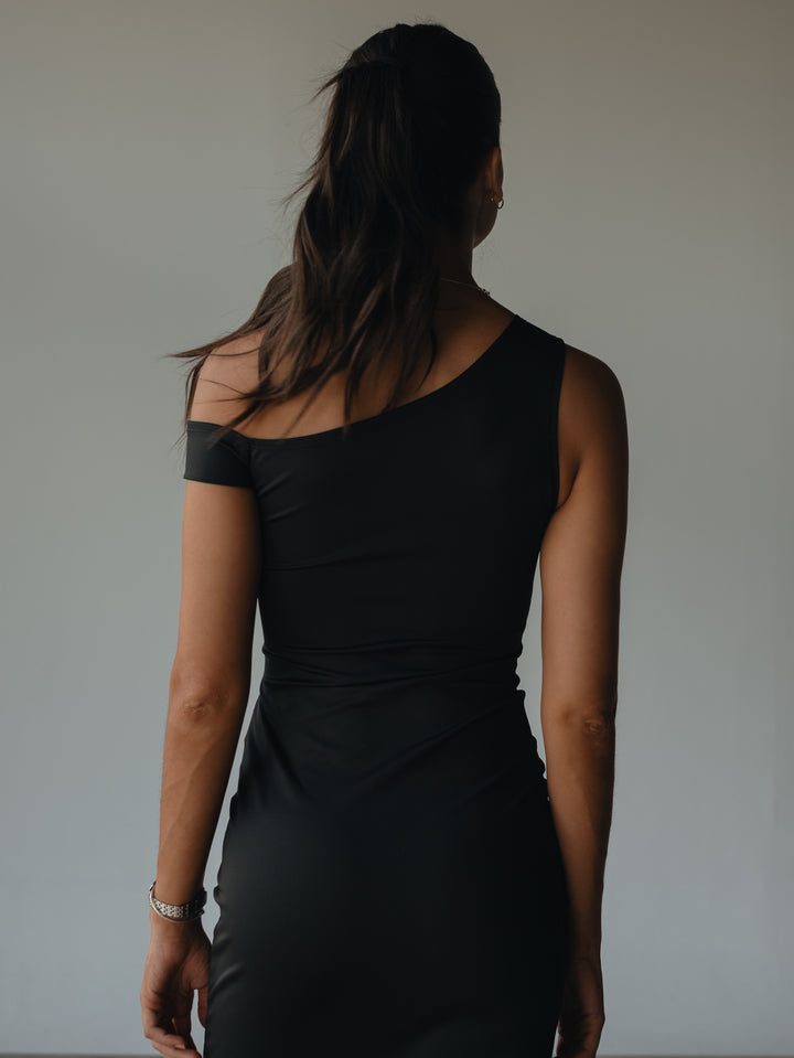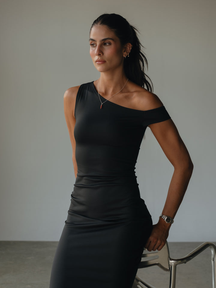 Take this dress out. Nuevo vestido color negro de silueta ajustada, diseñado con corte lateral y escote asimétrico para darle un toque especial a la prenda. Perfectos para tus noches out. Ideal para combinar con chaquetas tipo oversized.