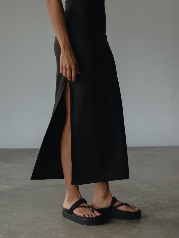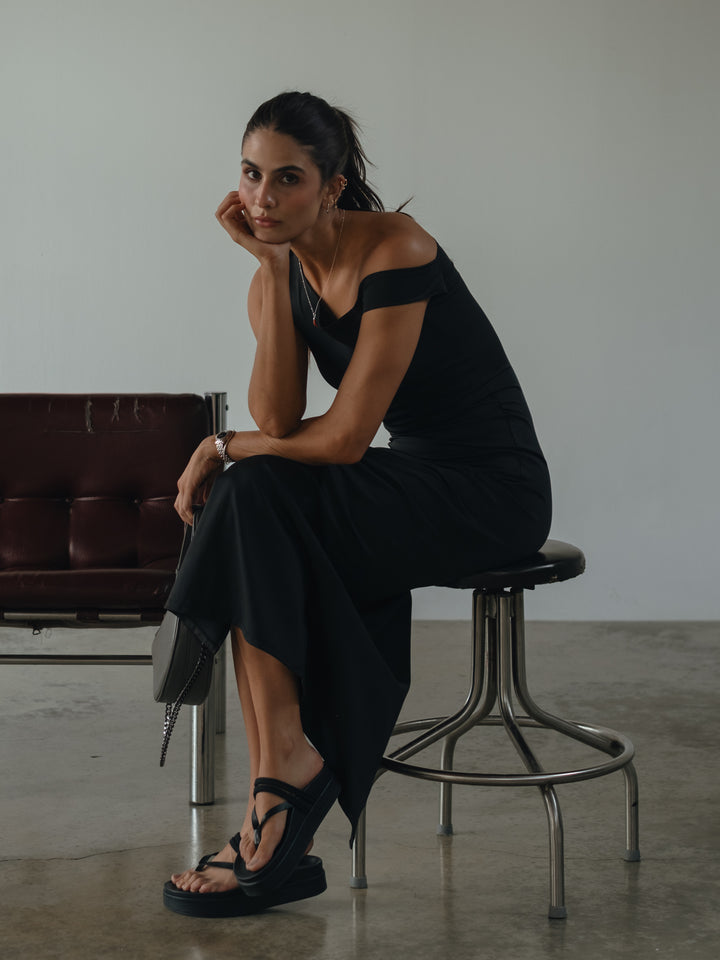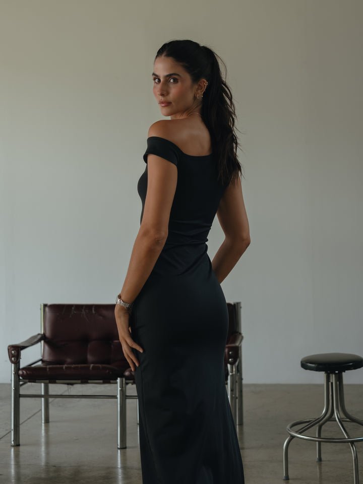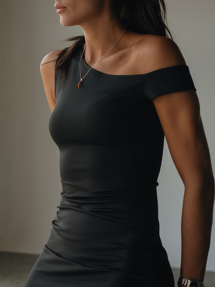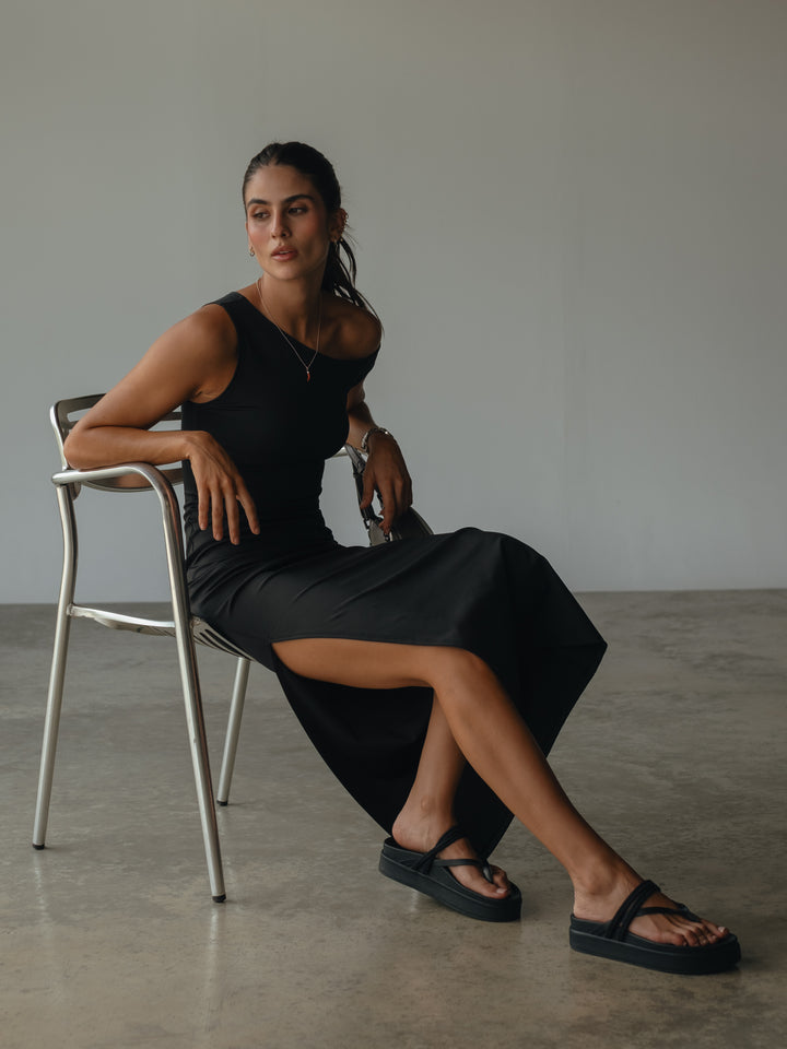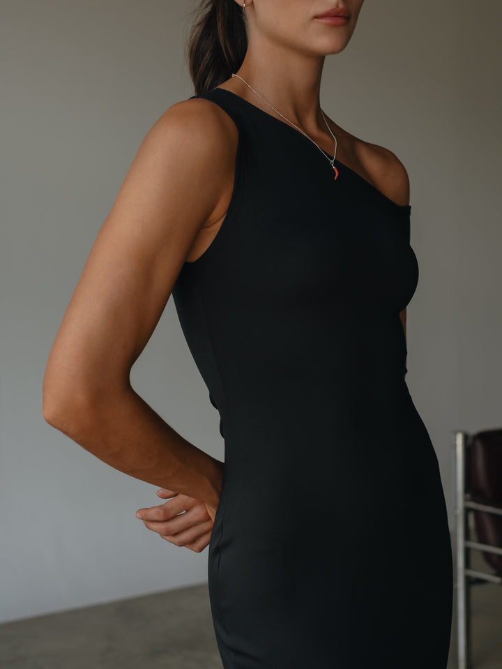 Take this dress out. Nuevo vestido color negro de silueta ajustada, diseñado con corte lateral y escote asimétrico para darle un toque especial a la prenda. Perfectos para tus noches out. Ideal para combinar con chaquetas tipo oversized.