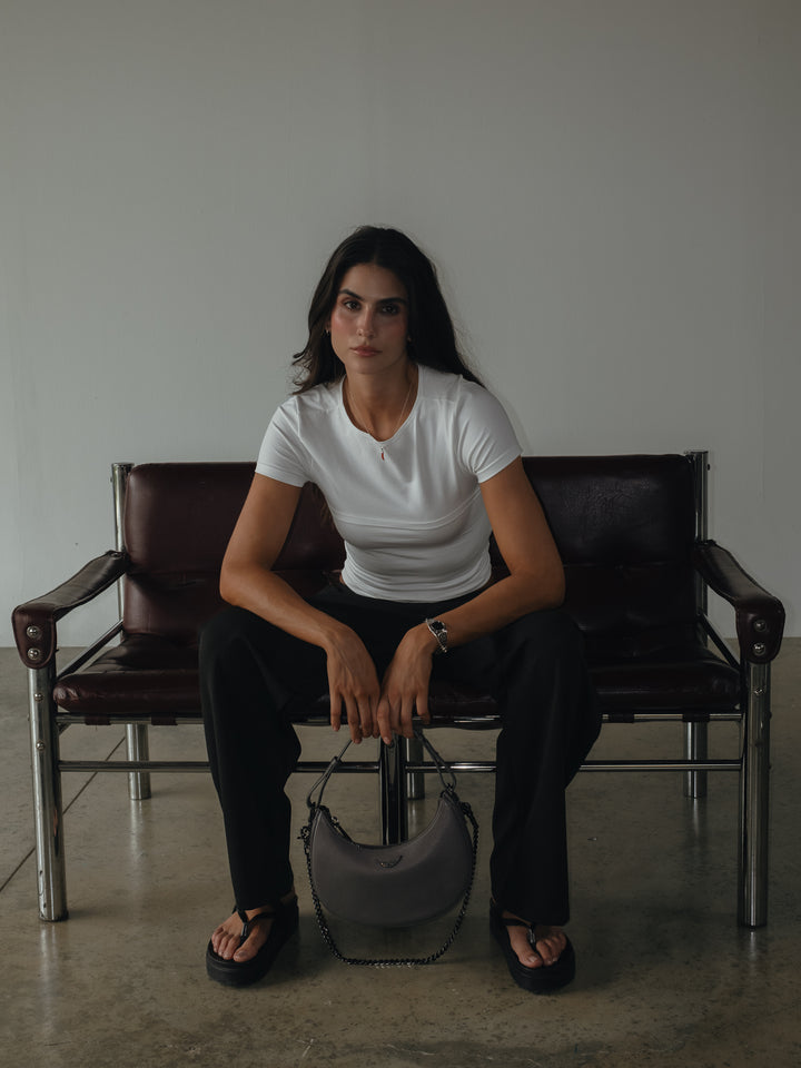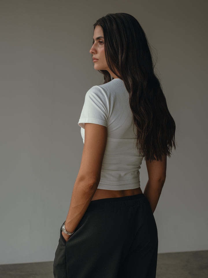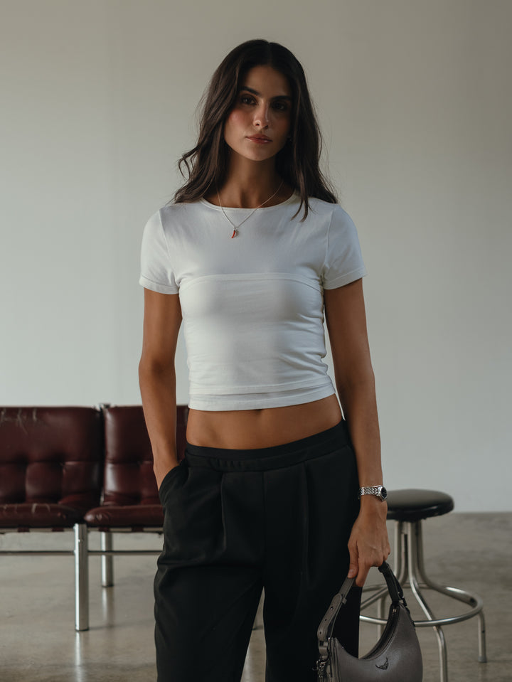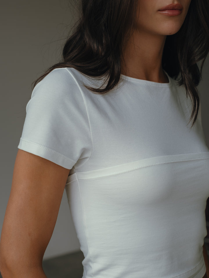 Comfort, to a t-shirt, así es nuestra nueva camiseta manga corta color crudo diseñada con capa adicional strapless. Ideal para todo tipo de busto. Made to match con nuestros jeans y pantalones.