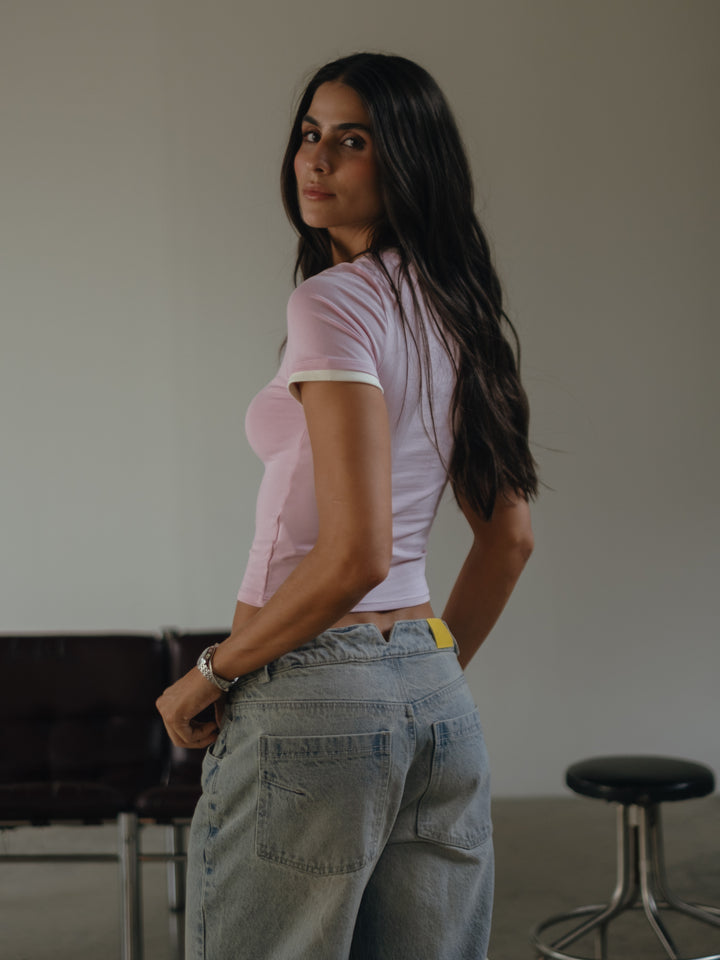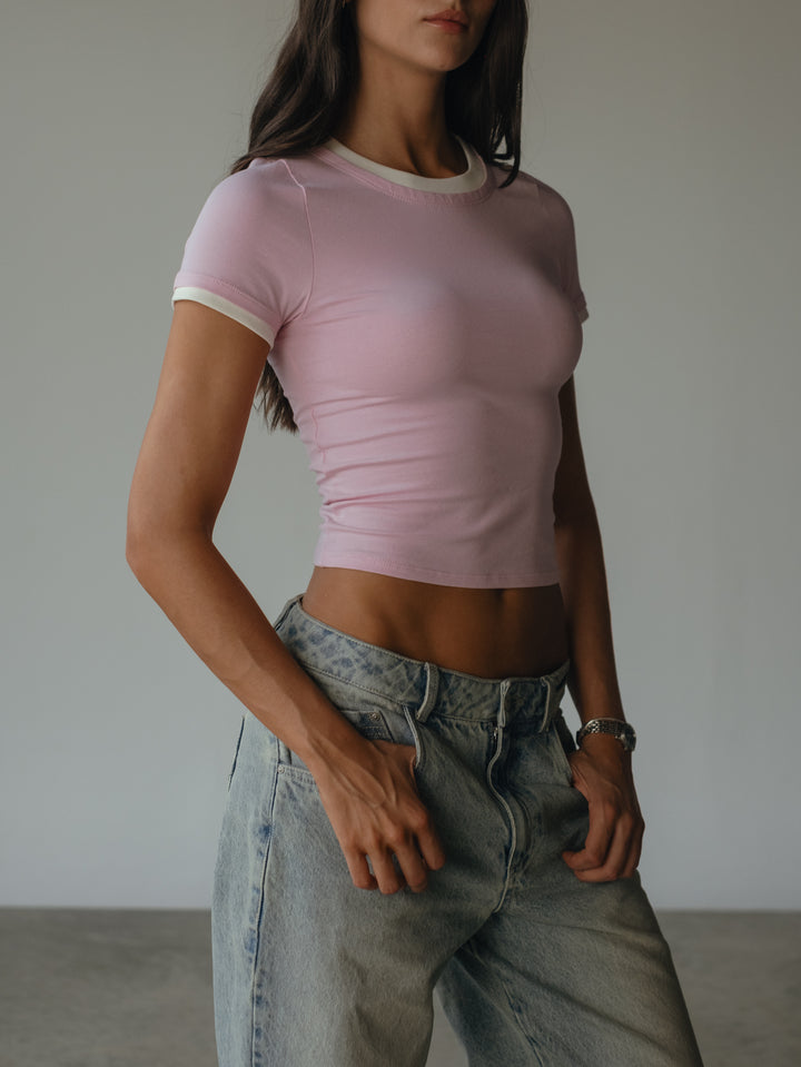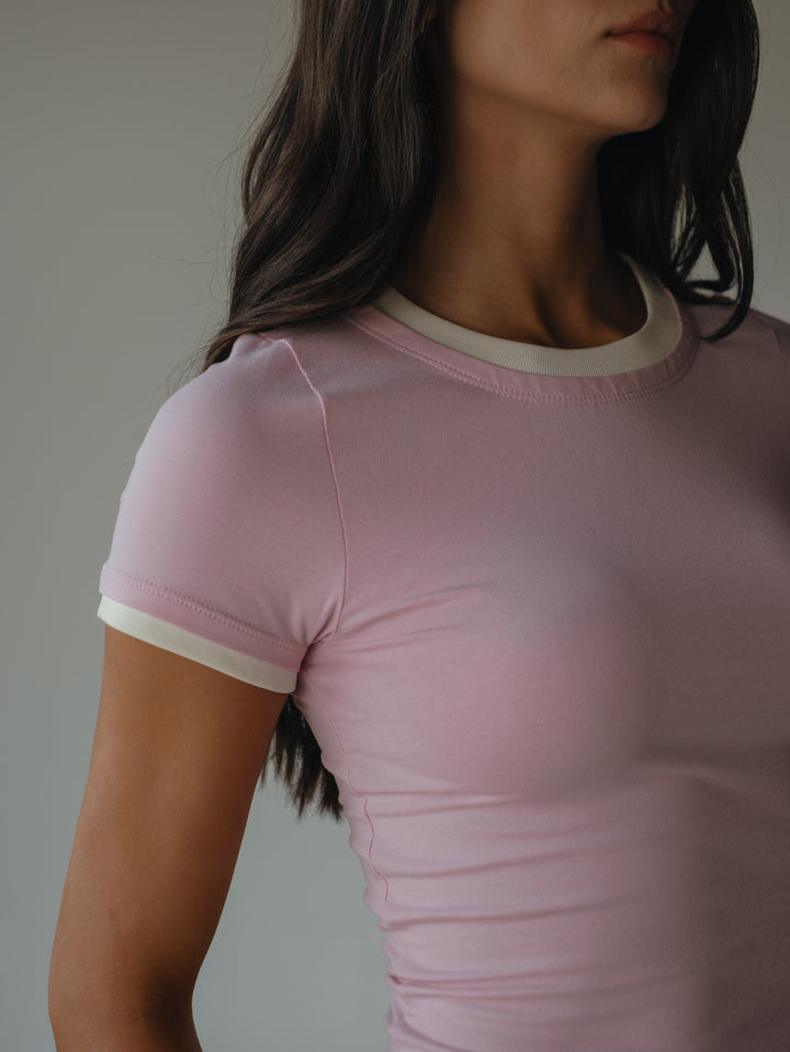 Meet your new daily piece. Nueva camiseta manga corta color rosado, diseñada con cuello y mangas en contraste color crudo, silueta ajustada y cuello redondo. Un básico ideal para todos los días. It goes great con nuestros jeans y pantalones.