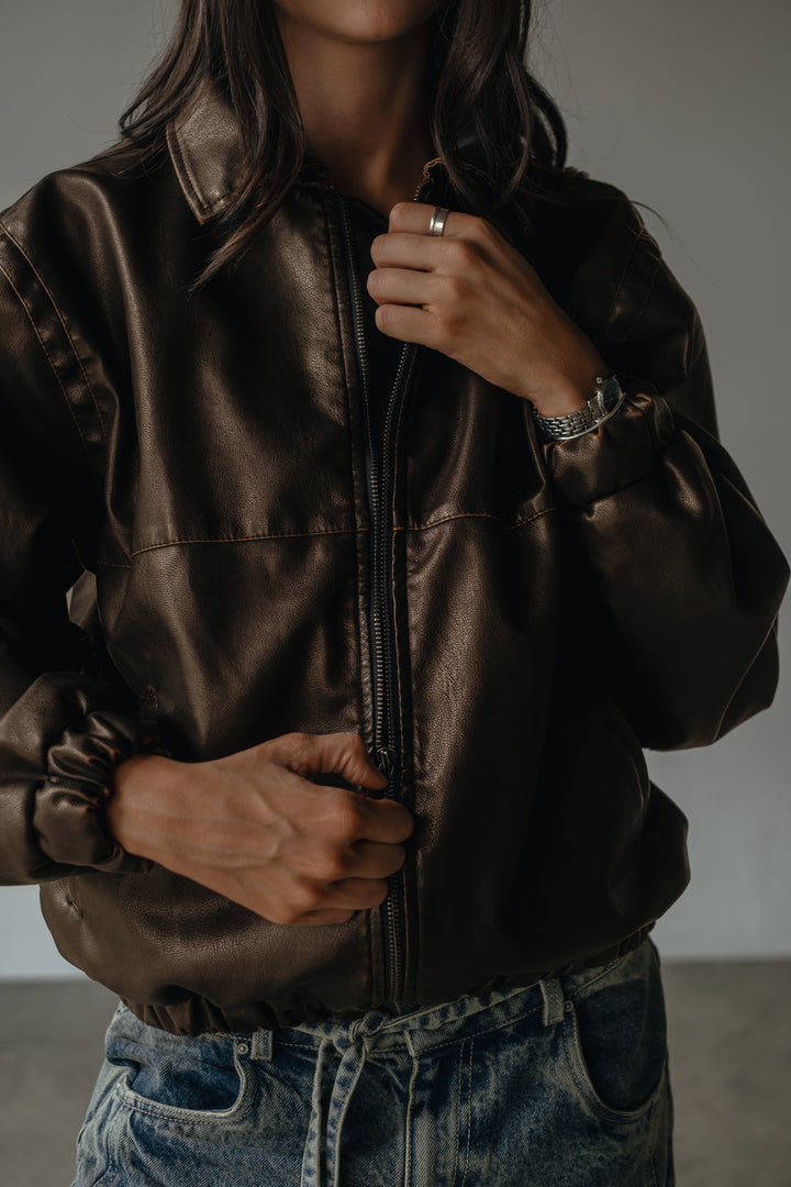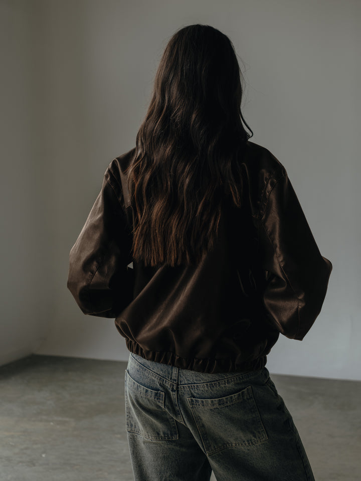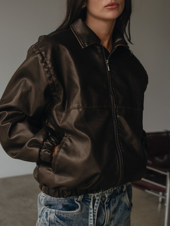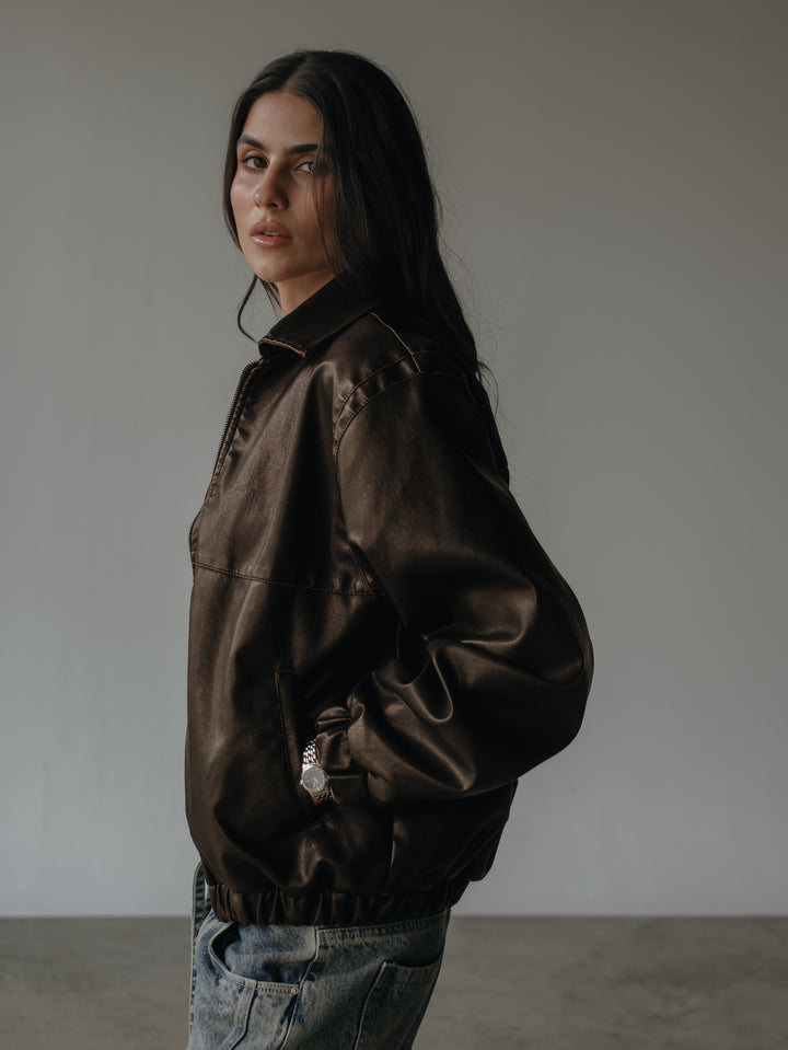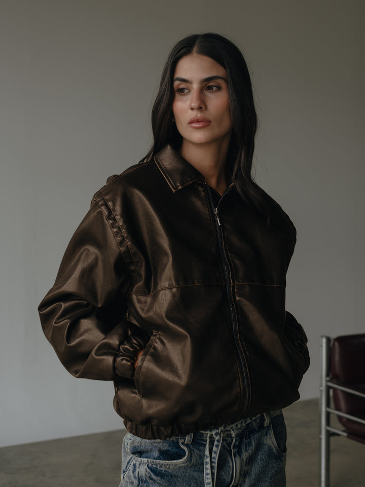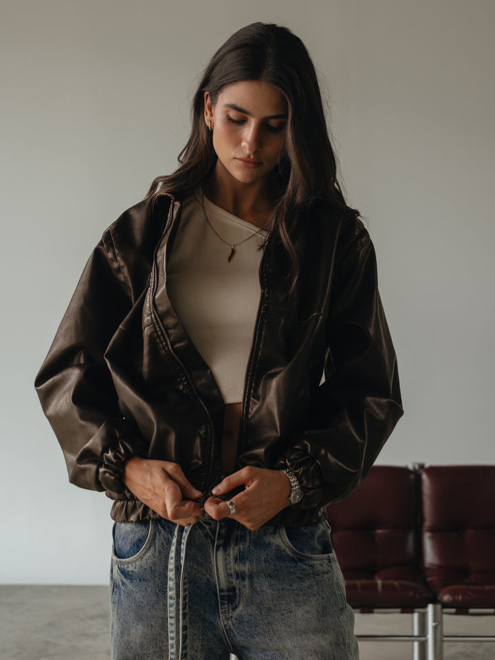 Meet your new must-have. Nueva chaqueta en cuero sintético color café vintage, diseñada con bolsillos frontales, cremallera y silueta oversized, pretina y puños enresortados que le dan un 80's mood. Match this jacket up con nuestras camisetas oversized.