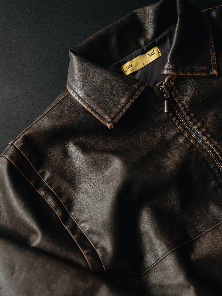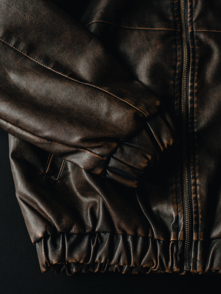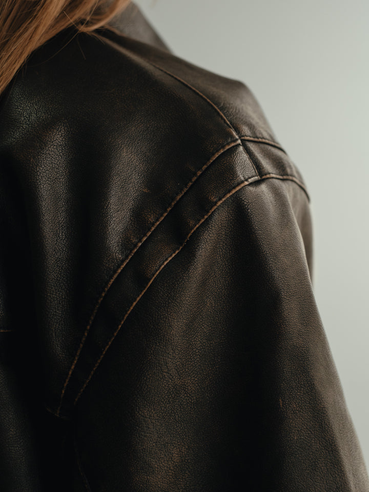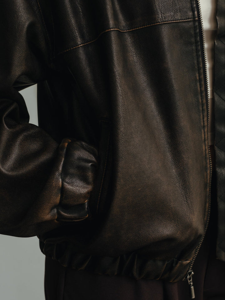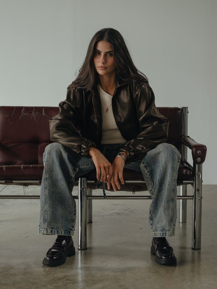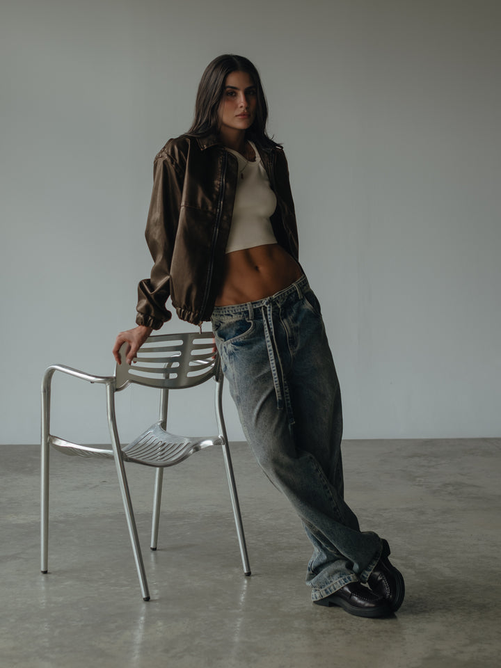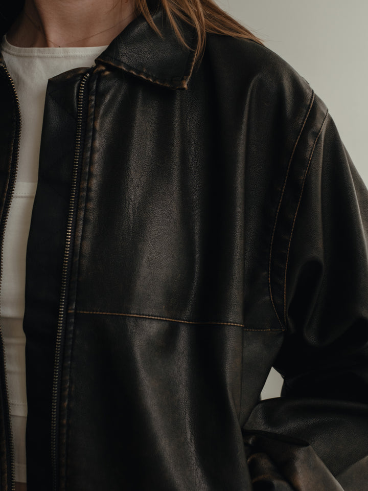 Meet your new must-have. Nueva chaqueta en cuero sintético color café vintage, diseñada con bolsillos frontales, cremallera y silueta oversized, pretina y puños enresortados que le dan un 80's mood. Match this jacket up con nuestras camisetas oversized.